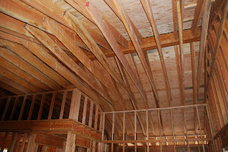 This pic is taken from the landing at what will be the top of the stairs. The opening for the window is on the right, and the bay window is in the center of the picture.